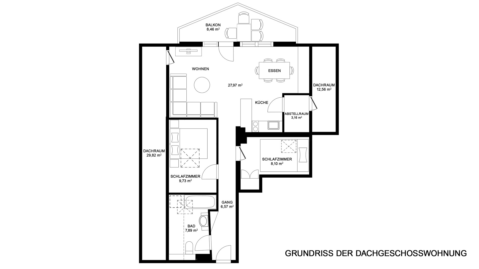 Die Wohnung teilt sich auf in einen Vorraum mit Garderobe, dem Flur welcher alle Zimmer erschließt, zwei Schlafzimmer mit Dachflächenfenstern, einem Badezimmer mit Badewanne/Dusche, WC und Waschmaschinenanschluss sowie dem offenen Wohnraum mit Essbereich, Küche und Abstellraum.