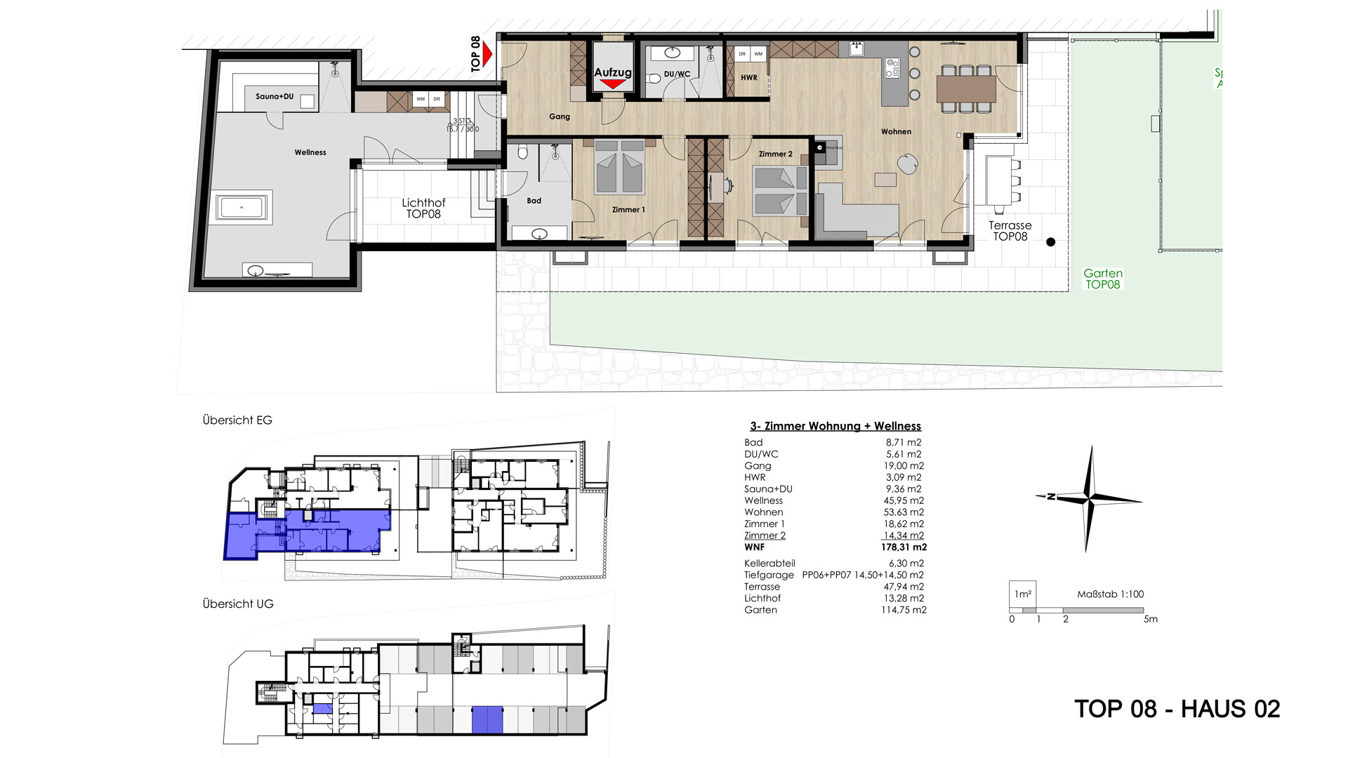 Die zwei Gartenwohnungen verfügen zudem über einen eigenen, mehr als 45 m² großen Wellnessbereich.
