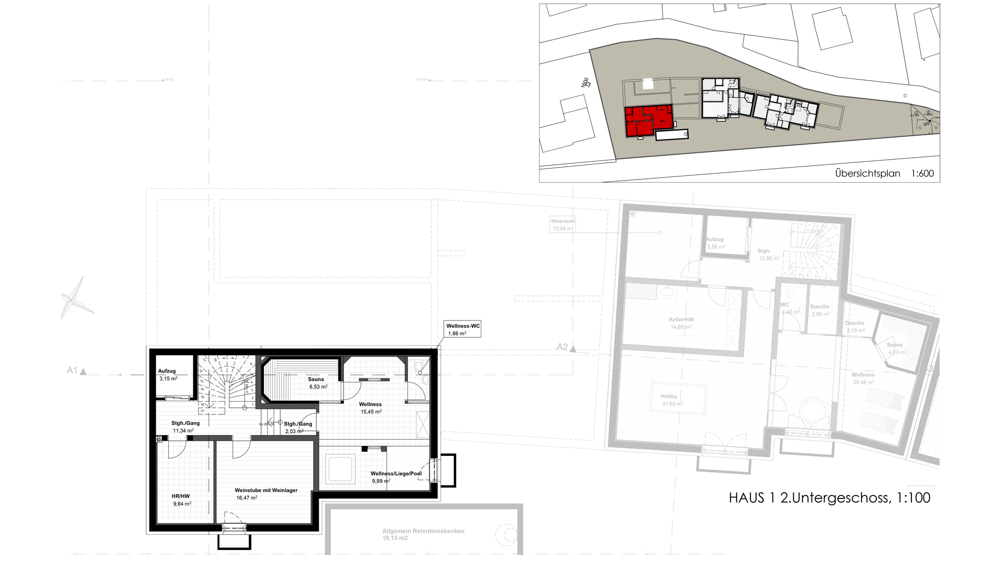 Ebenfalls auf dieser Ebene befindet sich der Wellnessbereich mit Ruheraum, Sauna, Dampfbad, Dusche und Toilette.