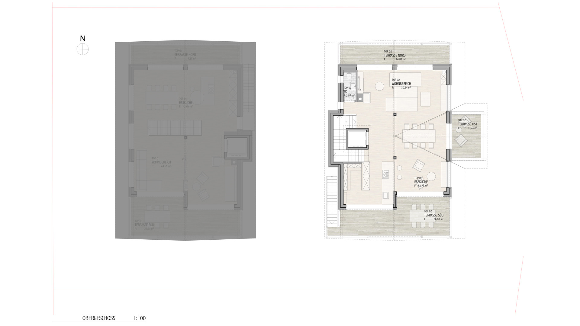 Das gesamte Dachgeschoss beinhaltet den offenen Wohnessbereich mit Dachstuhluntersicht und Panoramafenstern.
