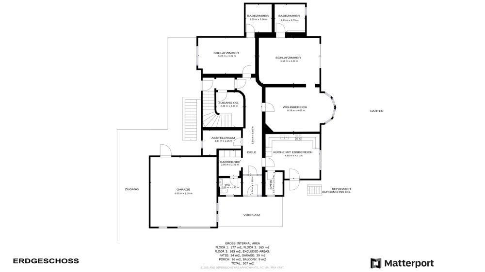 Das Haus selbst hat eine enorme Größe von ca. 507 m² Wohn/Nutzfläche und teilt sich in 3 Ebenen auf.