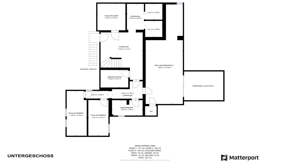 Hier befindet sich ein großer Vorraum, 3 Abstellräume, der Technikraum, zwei Schlafzimmer, welche sich ein komfortables Badezimmer teilen sowie der übergroße Fitness/Wellnessbereich mit WC und Ausgang auf eine Terrasse/Lichthof.