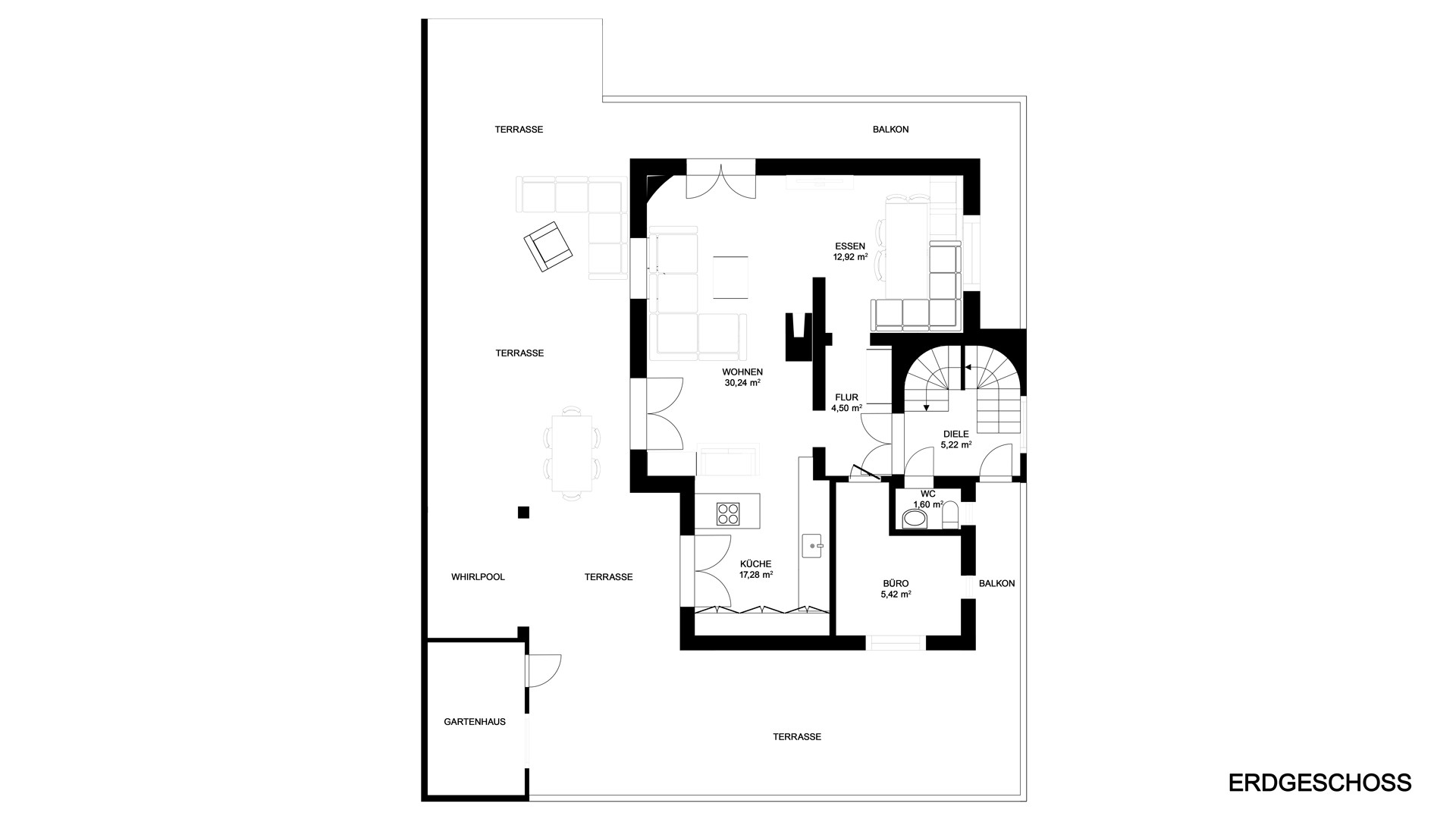 Hier wurde eine kleine Wohlfühloase geschaffen. Zahlreiche Sitzmöglichkeiten, eine Outdoorküche, ein Gartenhaus, wo man auch eine Sauna installieren könnte, sowie ein großer Whirlpool von Villeroy & Boch stehen hier zur Verfügung.
