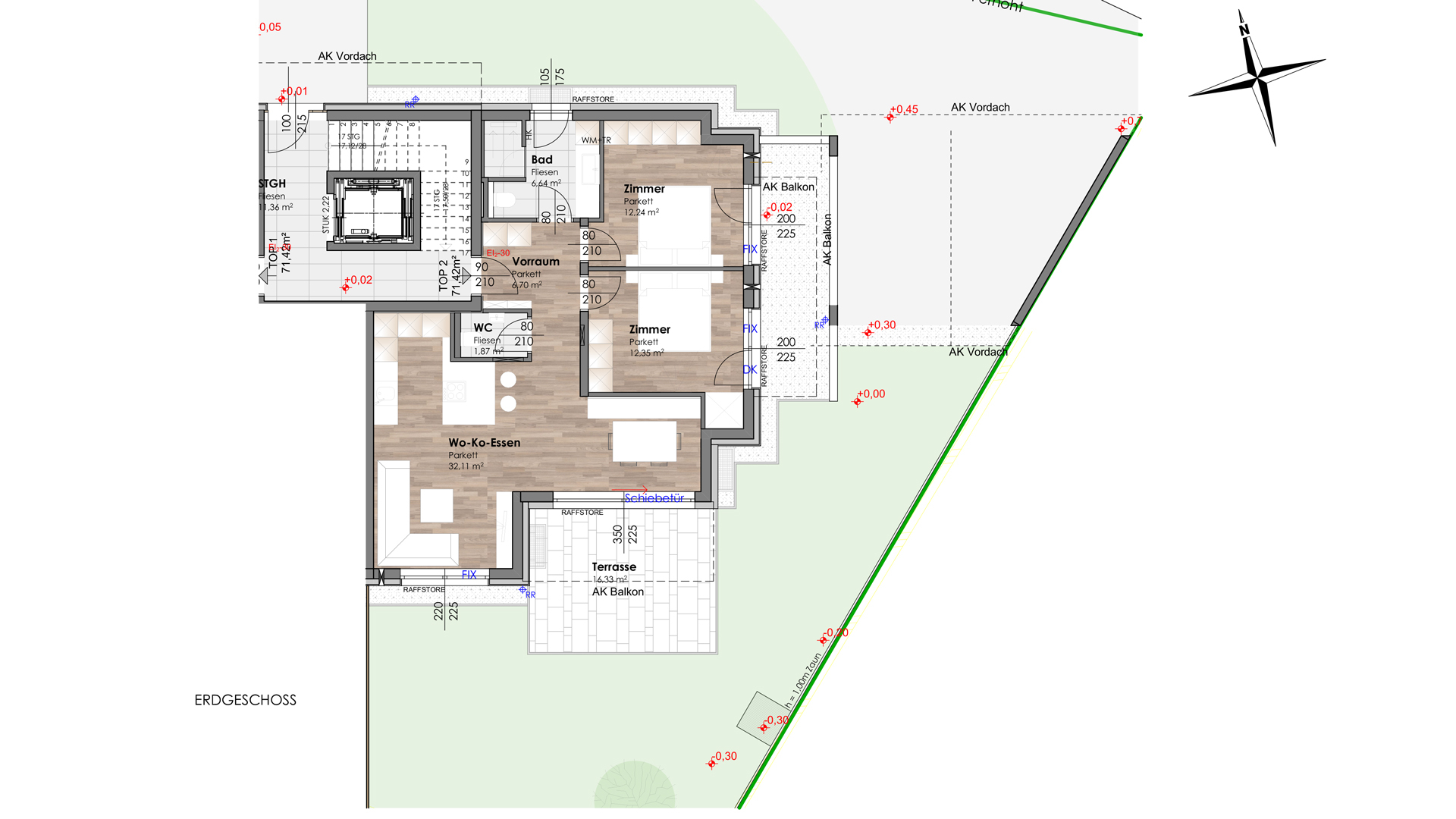 Hierbei handelt es sich um die ca. 72 m² große Gartenwohnung Top 2 welche sich über eine Hälfte des Erdgeschosses erstreckt.