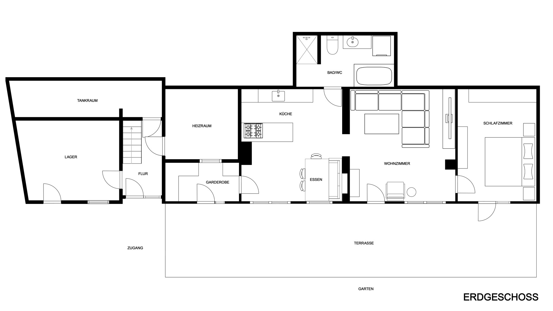 Bestehend aus dem Eingangsbereich mit Einbauschränken und Garderobe, dem Koch & Essbereich mit komplett ausgestatteter offener Küche, dem Wohnbereich mit gemütlicher Sofalandschaft und Sichtkamin, einem geräumigen Schlafzimmer und dem hochwertigen Badezimmer samt großer Badewanne, Dusche und WC. Vom Wohnbereich und dem Schlafzimmer gelangt man auf die Terrasse und sodann in den Garten.