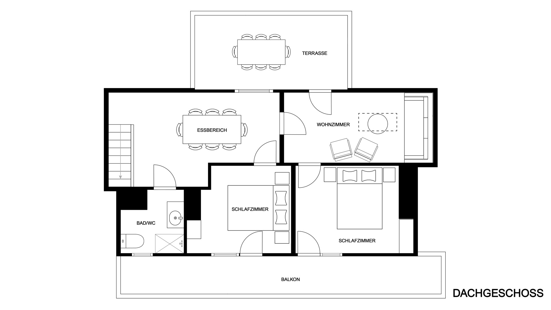 Die Wohnung teilt sich auf in den Eingangsbereich mit Garderobe, eine mit allen Geräten ausgestattete Küche, einen eigenen Essbereich mit großem Esstisch und den gemütlichen Wohnbereich. Weiters verfügt das Apartment über zwei Schlafzimmer, ein modernes Badezimmer sowie eine komplett überdachte Terrasse und einen großen Balkon. Zahlreiche Altholzelemente und die durch die Lage im Dachgeschoss gebotene Raumhöhe sorgen für ein angenehmes Wohnerlebnis.