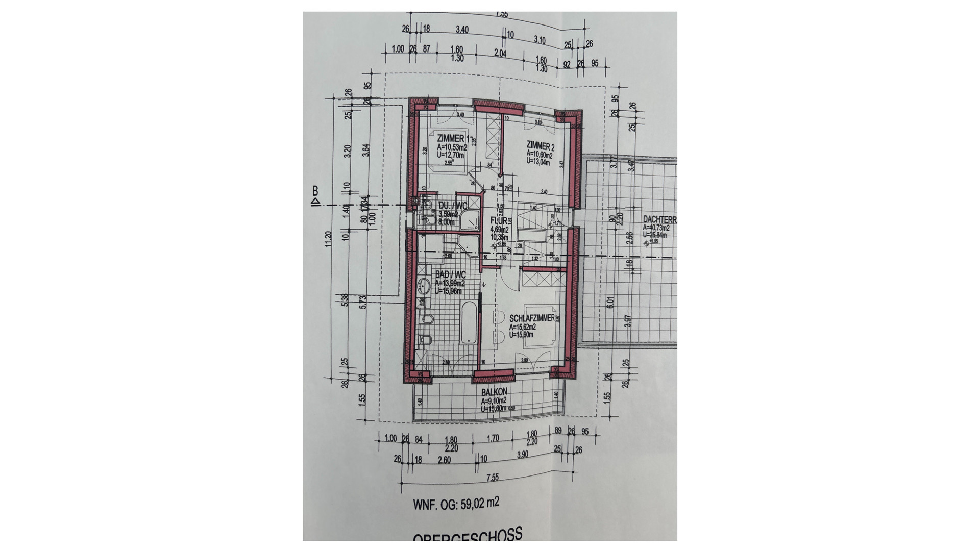 Ein weiteres Schlafzimmer und ein Badezimmer, ein großer Vorraum sowie eine 40 m² große Dachterrasse sind vorhanden.