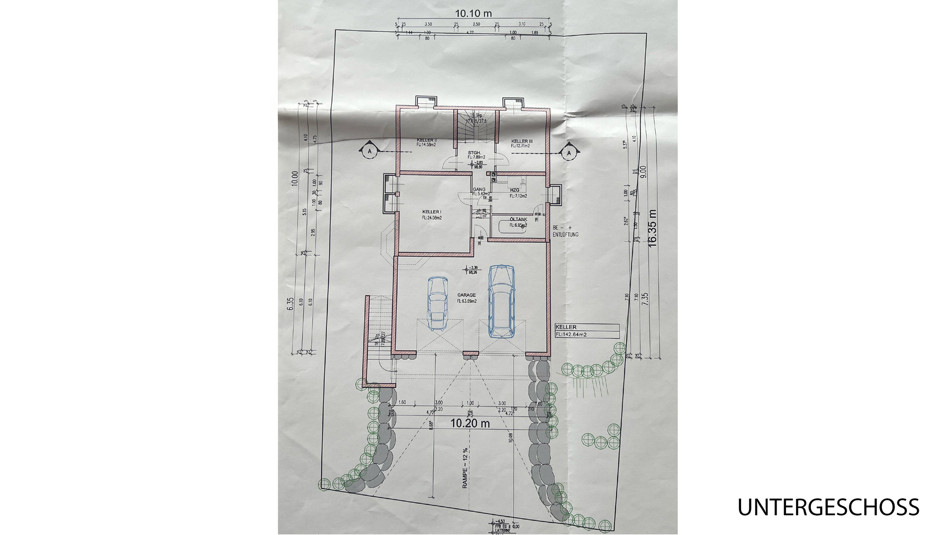 Aufgrund der leichten Hanglage fährt man von der Zufahrtsstraße auf den Vorplatz und sodann direkt in die große Garage, welche Platz für bis zu 3 Fahrzeuge bietet. Von der Garage gelangt man in einen Vorraum und von dort wiederum in ein Gästezimmer, einen Abstellraum sowie einen Hobbyraum; der Technikraum befindet sich ebenfalls auf dieser Ebene.