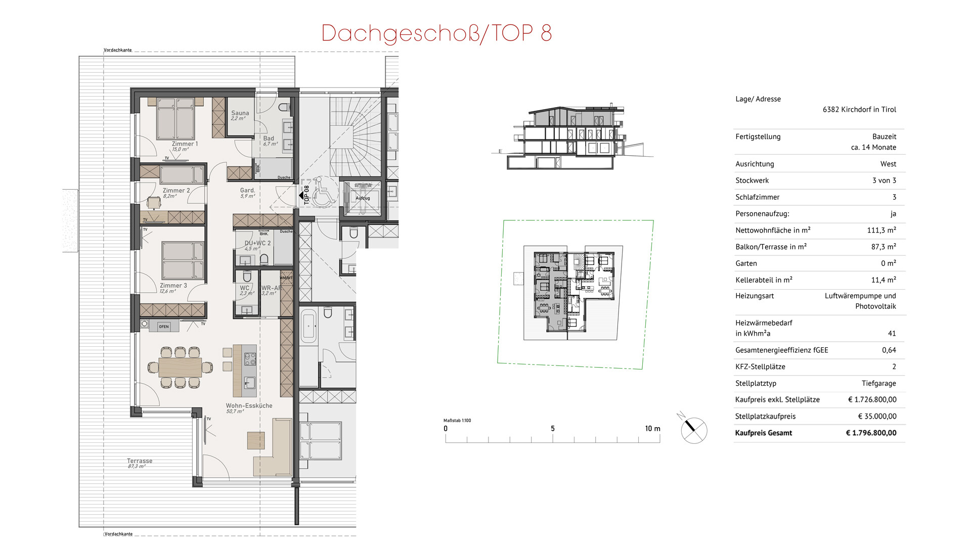 Über die großzügige, hauseigene Tiefgarage gelangen Wohnungseigentümer mittels Lift bequem in alle Etagen. Modernen Anforderungen entsprechend, bieten alle Wohneinheiten schwellenfrein Zugang und garantieren hohen Sicherheitsstandard. Die Bausubstanz des Gebäudes sowie die exklusive Grundausstattung der Wohnungen, entsteht in Zusammenarbeit mit heimischen Professionisten. Im Vordergrund der architektonischen Gestaltung steht die Verbindung aus Mensch und Natur, die sich im Materialeinsatz widerspiegelt.