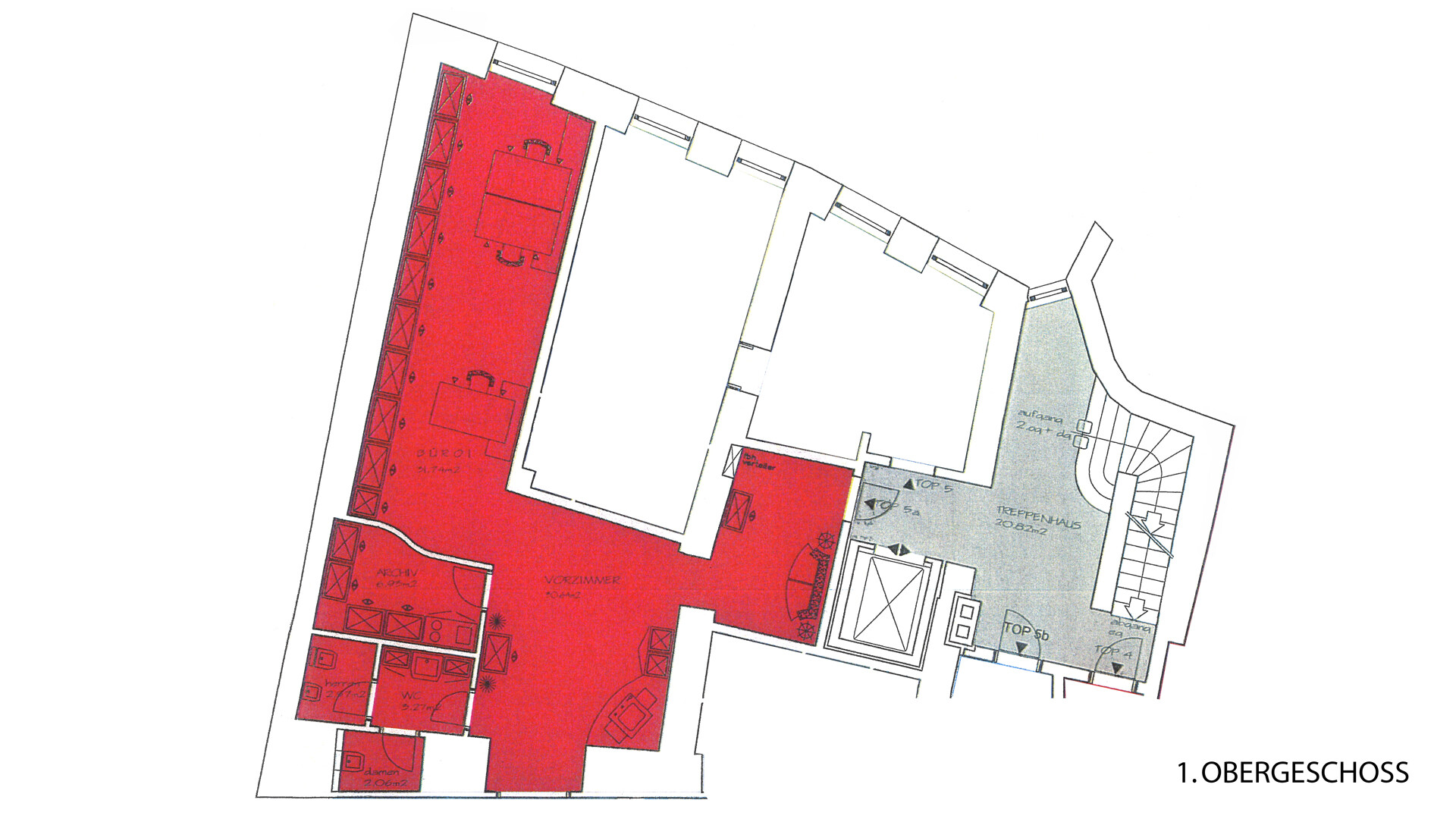Es sind 2 separate Toiletten mit einem Vorraum und eine kleine Teeküche mit Archiv vorhanden.