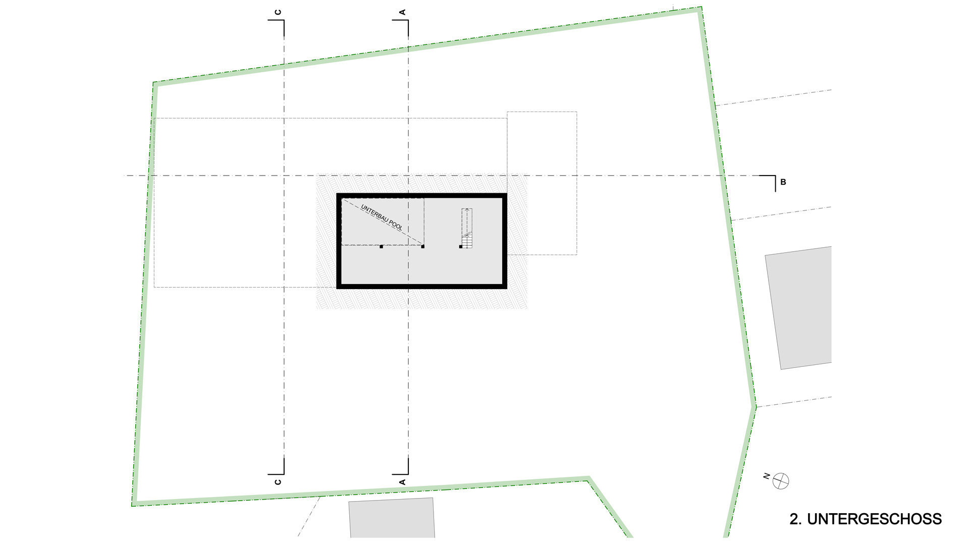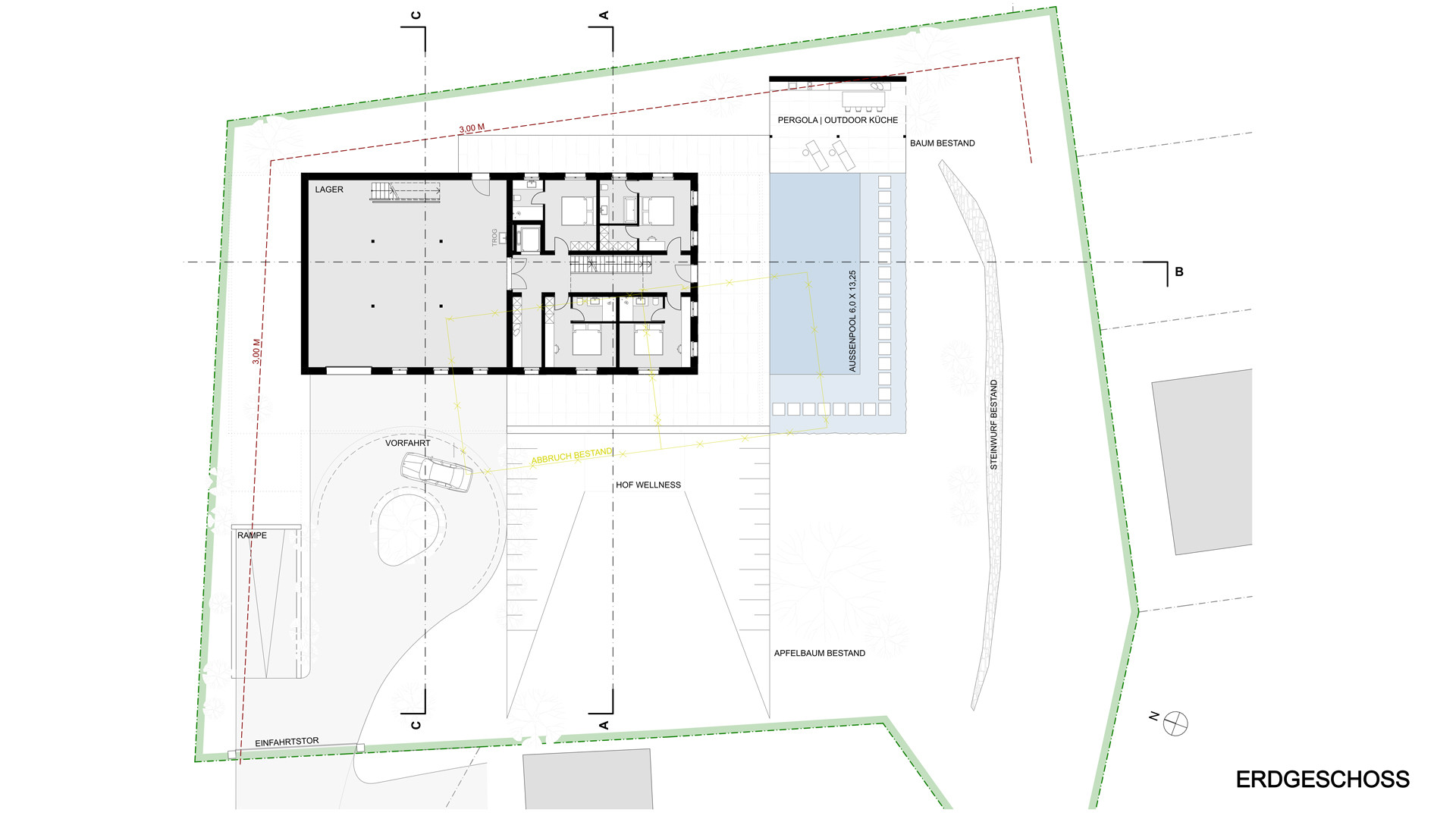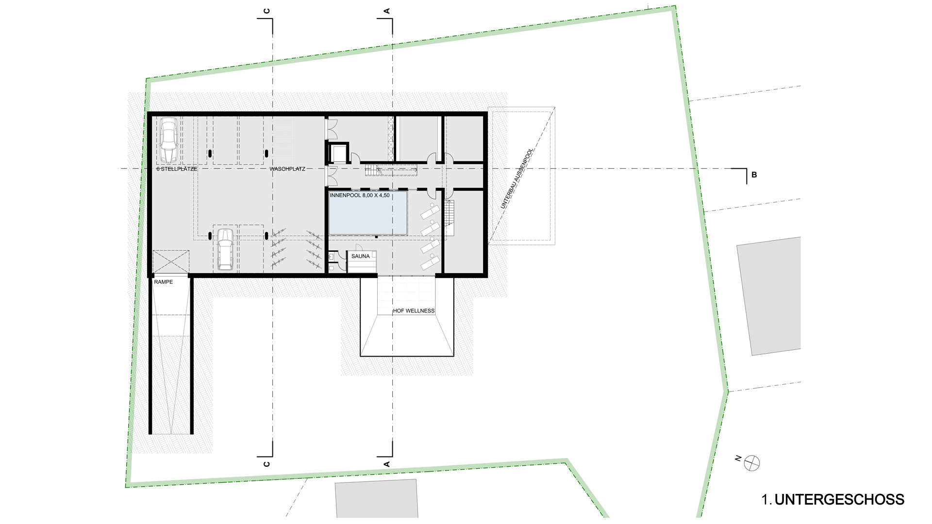 Dabei wurde im Untergeschoss eine Tiefgarage für bis zu 9 PKW, Waschplatz, Sportgeräteraum, Weinlager/Keller und großer Wellnessbereich mit Indoorpool, Sauna, Ruhebereich und Terrasse eingeplant.