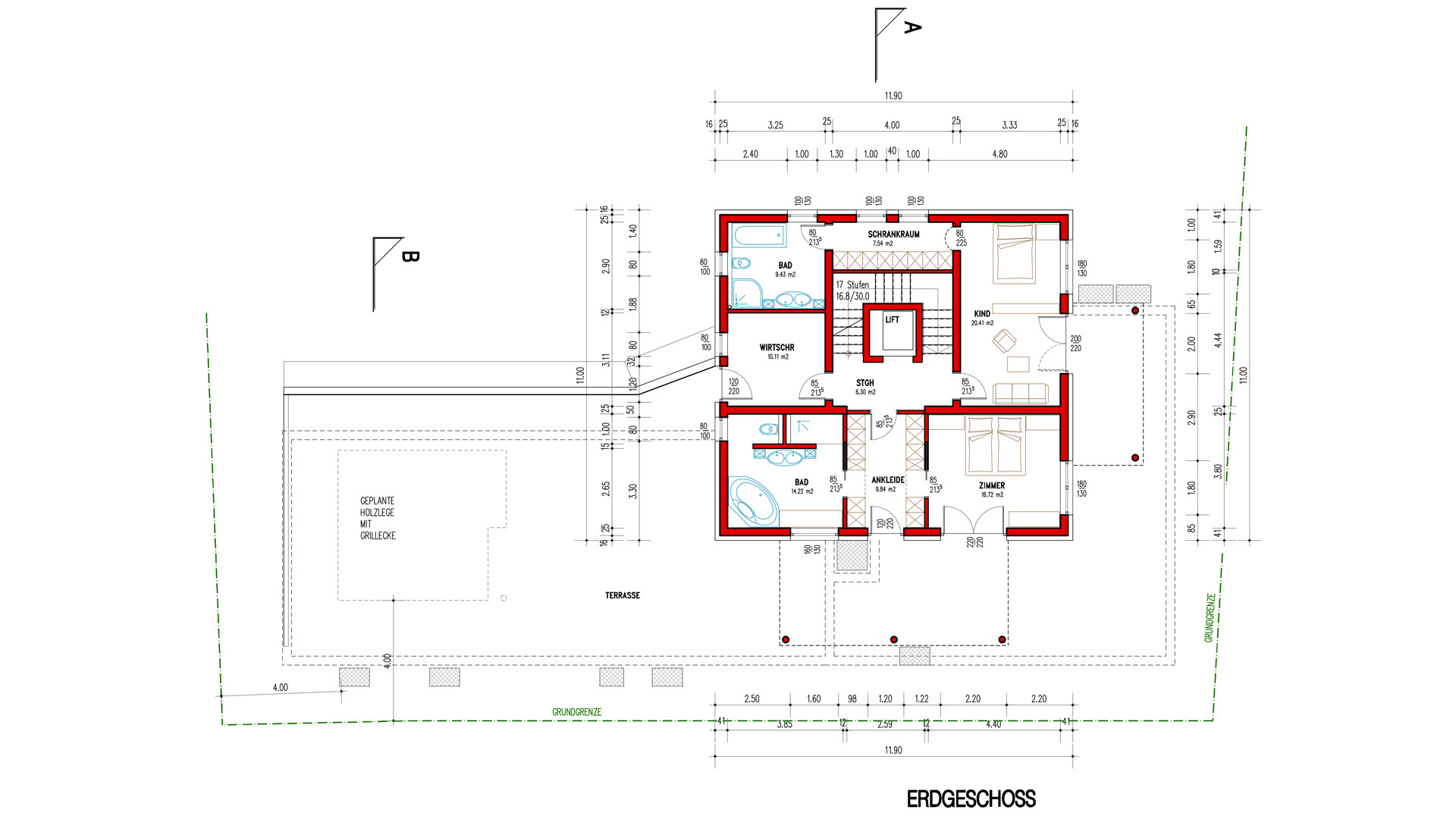 Über das geräumige Treppenhaus oder mit dem privaten Lift gelangt man in die höhergelegene "Schlafebene".