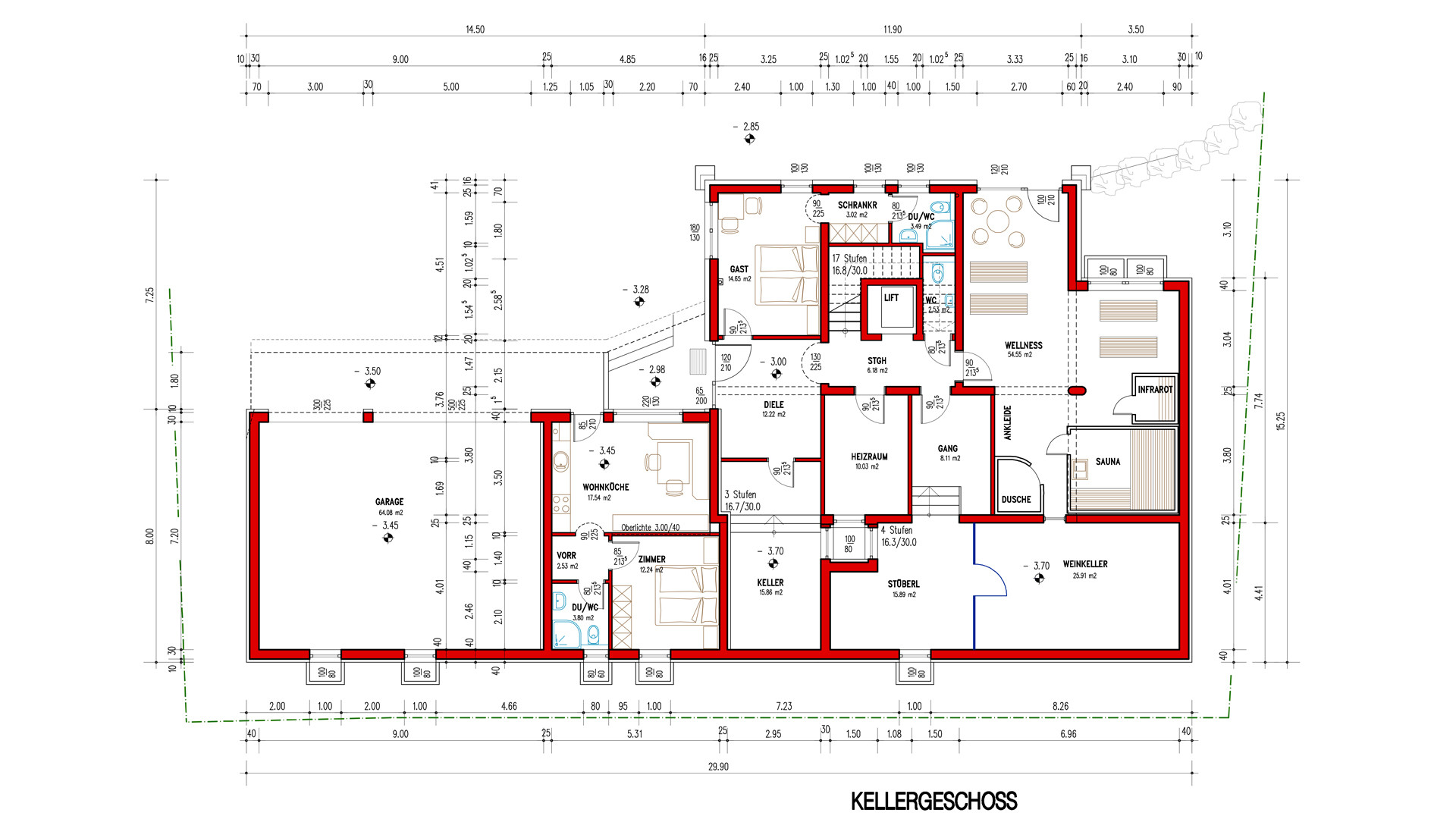 Ein Highlight ist der ca. 50 m² große Weinkeller mit Gewölbedecke, "Stüberl" und großem Weinlagerraum. Weiters befinden sich auf dieser Ebene eine Gäste-Toilette und der Technikraum.