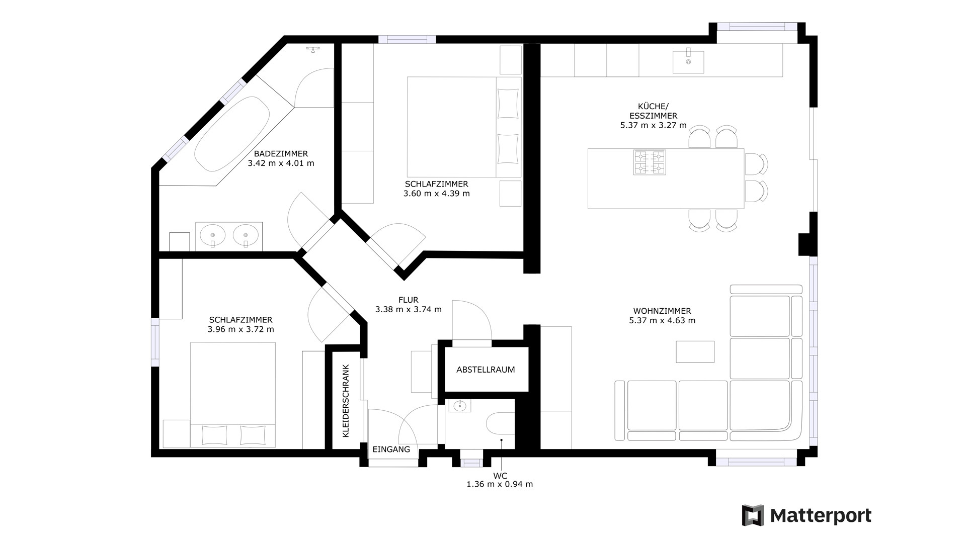 Sodann betritt man das große Wohn/Esszimmer mit einer hochwertigen Designerküche, welche mit Miele Geräten ausgestattet ist.