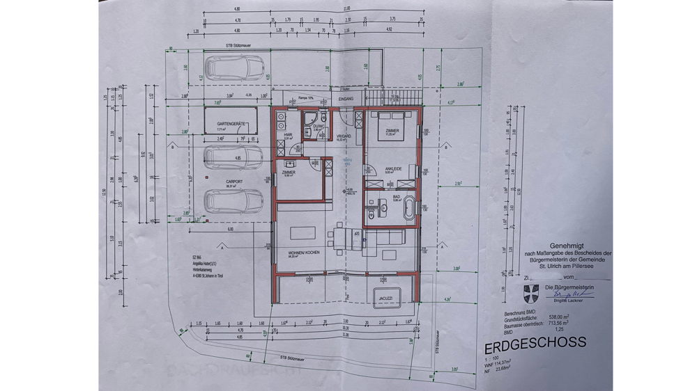 Man betritt das Haus über die Diele mit freiem Blick in den Wohn-/Essbereich und auf den aus jedem Raum in dieser Ebene sichtbaren offenen gehackten Dachstuhl. Eine fast vollständig verglaste und grossflächig zu öffnende Südfront gibt den Blick auf die grosszügig angelegte Süd Terrasse frei, die mit Loungebereich/Sitzgruppe, Feuerschale und ganzjährig beheiztem Whirlpool zum Verweilen einlädt.