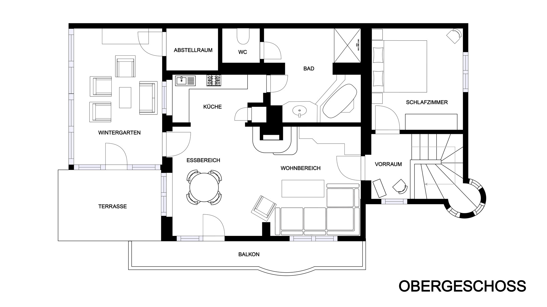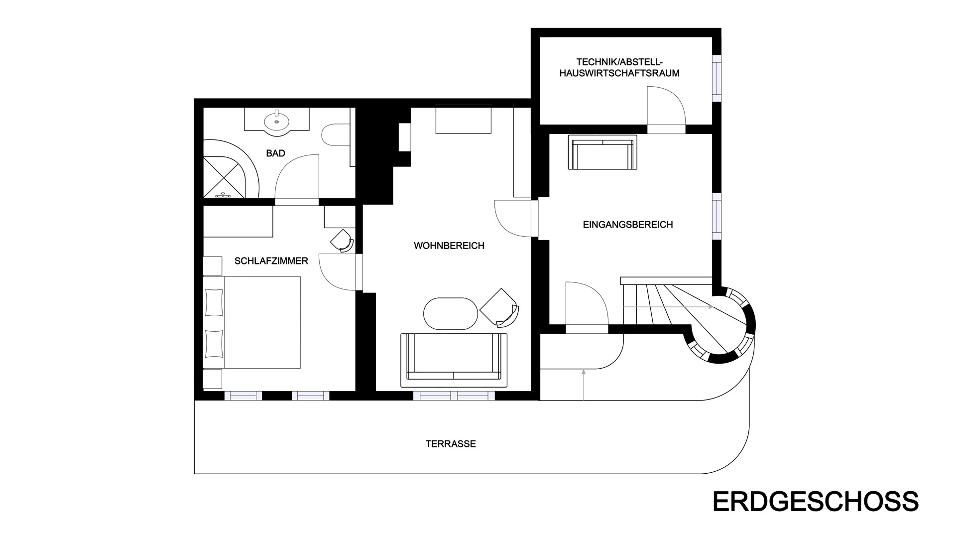 Im Erdgeschoss befindet sich der große Eingang/Vorraum mit angrenzendem Abstell/Wirtschaft/Technikraum.