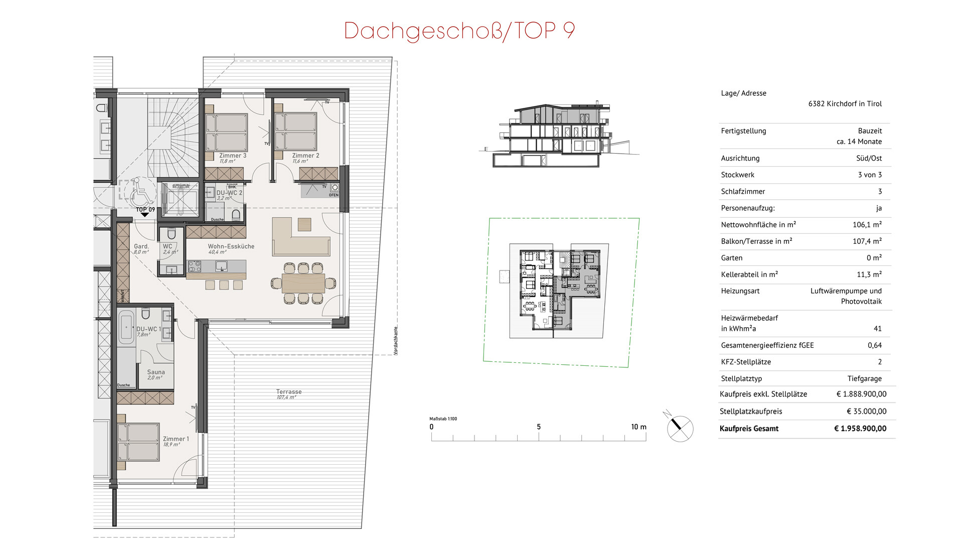Über die großzügige, hauseigene Tiefgarage gelangen Wohnungseigentümer mittels Lift bequem in alle Etagen. Modernen Anforderungen entsprechend, bieten alle Wohneinheiten schwellenfrein Zugang und garantieren hohen Sicherheitsstandard. Die Bausubstanz des Gebäudes sowie die exklusive Grundausstattung der Wohnungen, entsteht in Zusammenarbeit mit heimischen Professionisten. Im Vordergrund der architektonischen Gestaltung steht die Verbindung aus Mensch und Natur, die sich im Materialeinsatz widerspiegelt.