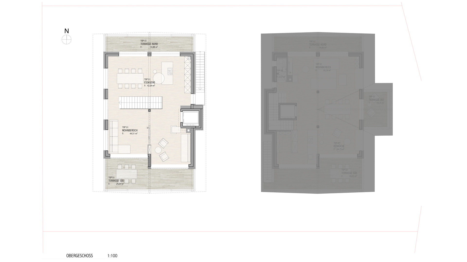 Das gesamte Dachgeschoss beinhaltet den offenen Wohn/Essbereich mit Dachstuhluntersicht und Panoramafenstern.