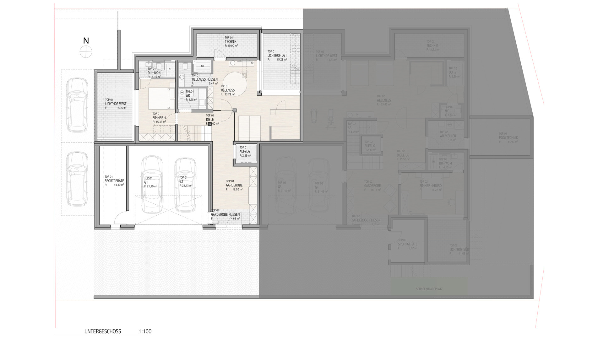 Dieses Chalet teilt sich wie folgt auf: Im Untergeschoss gelangt man über eine repräsentative Privatzufahrt direkt in die großzügige Doppelgarage dieses Hauses mit separatem Sportgeräteraum.