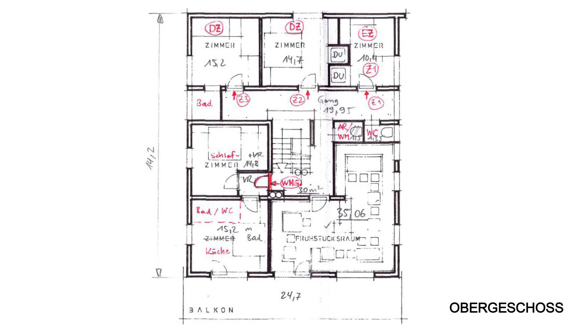Im 1. Obergeschoss befindet sich die Diele, eine kleine Wohnung sowie 3 Schlafzimmer mit 3 Duschen , 1 Abstellraum und 1 WC sowie ein ca. 35 m2 großer Frühstücksraum und 1 großer Balkon.