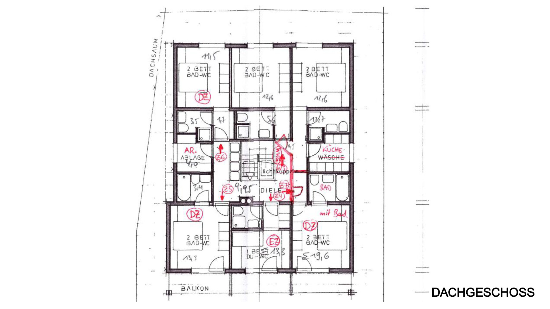 Im Dachgeschoss sind die Diele, 6 Schlafzimmer mit 6 Bädern, 1 Abstellraum und 1 Küche und 1 Balkon vorhanden.